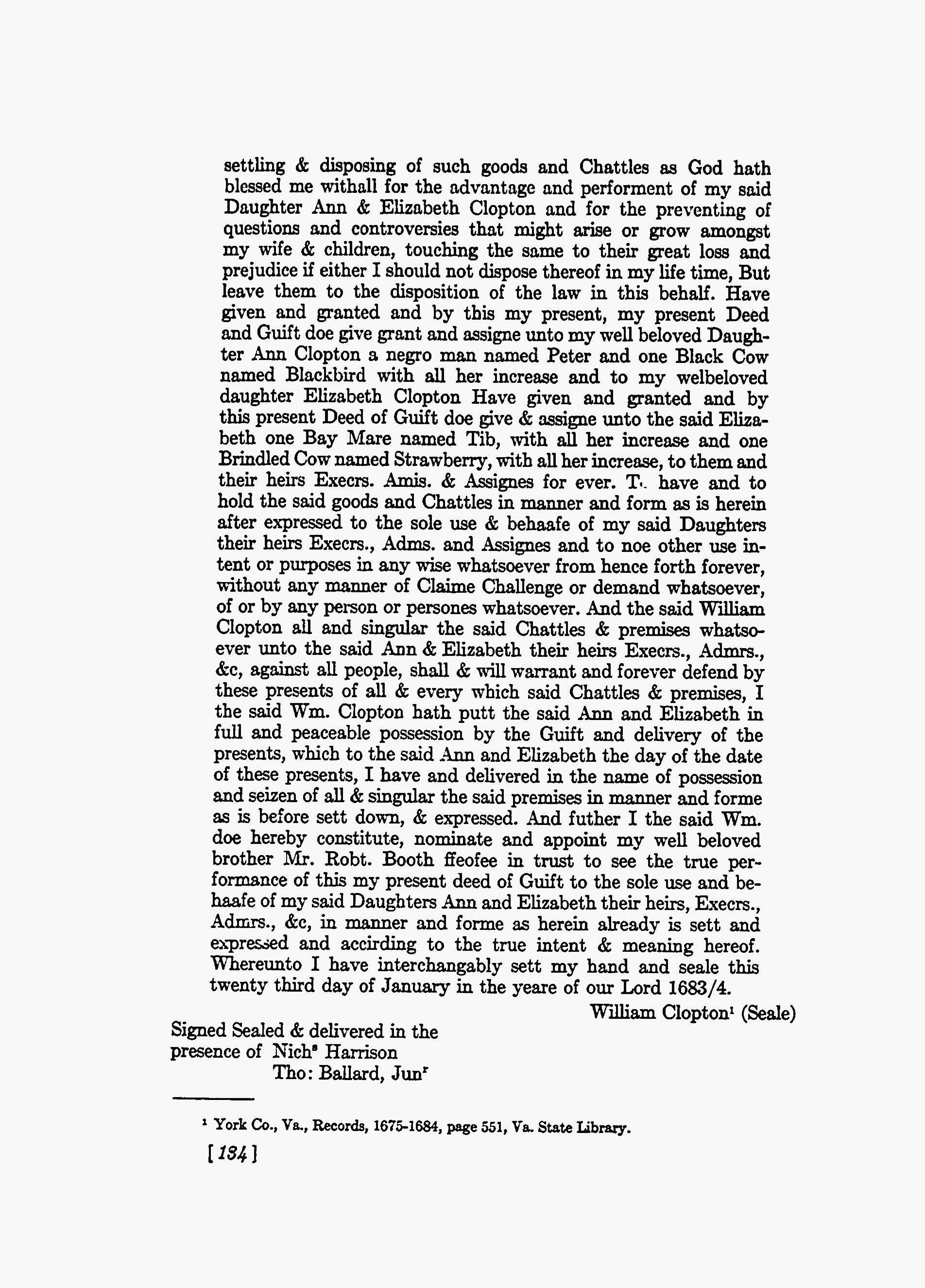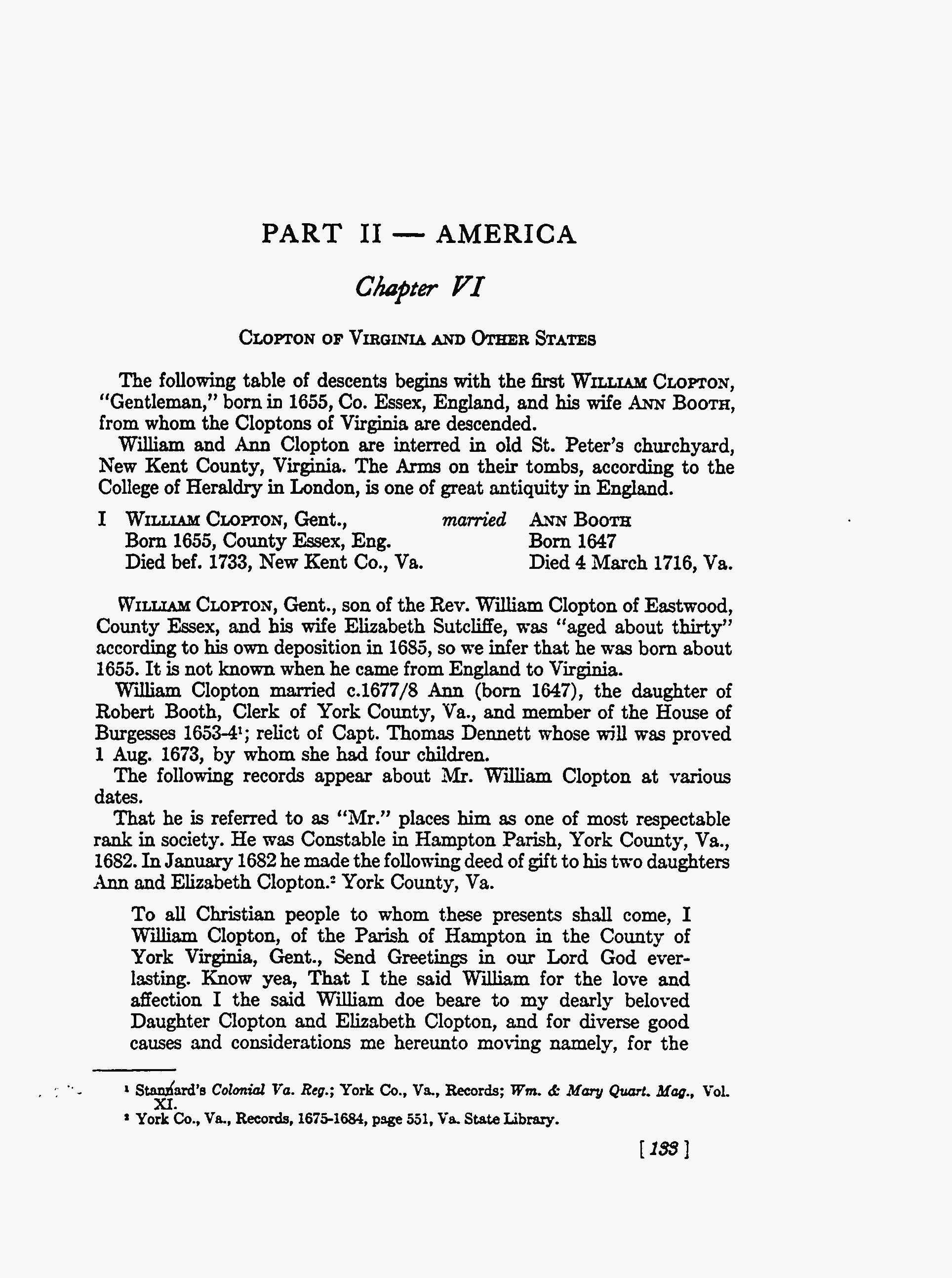 The ancestor of this family in Virginia was WILLIAM’ CLOPTON, aged about thirty in 1685. In 1682 he was constable of Hampton Parish, York county, and on January 23, 1682-’83 he made a deed of gift to his daughters Ann and Elizabeth. He married Ann Booth, widow of Thomas Dennett, and daughter of Robert Booth, clerk of York court.