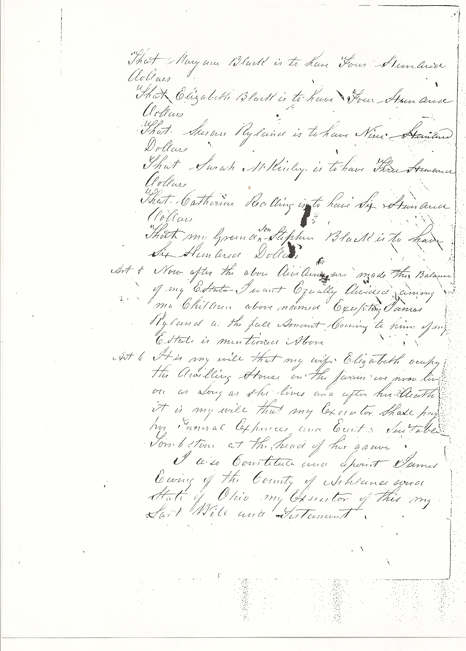 Many Ewings moved to Richland (then Ashland County) and other counties in Ohio, in the 1810s and 1820s. Catherine gave birth to eleven children. In the 1870 Census, she lives in the town of Hayesville with her grandson Stephen K. Black, son of her firstborn Mary Ann. By then, Catherine is a great-grandmother, for Stephen had a seven-month-old girl named Lunette. Catherine’s husband William had passed on, in 1867.