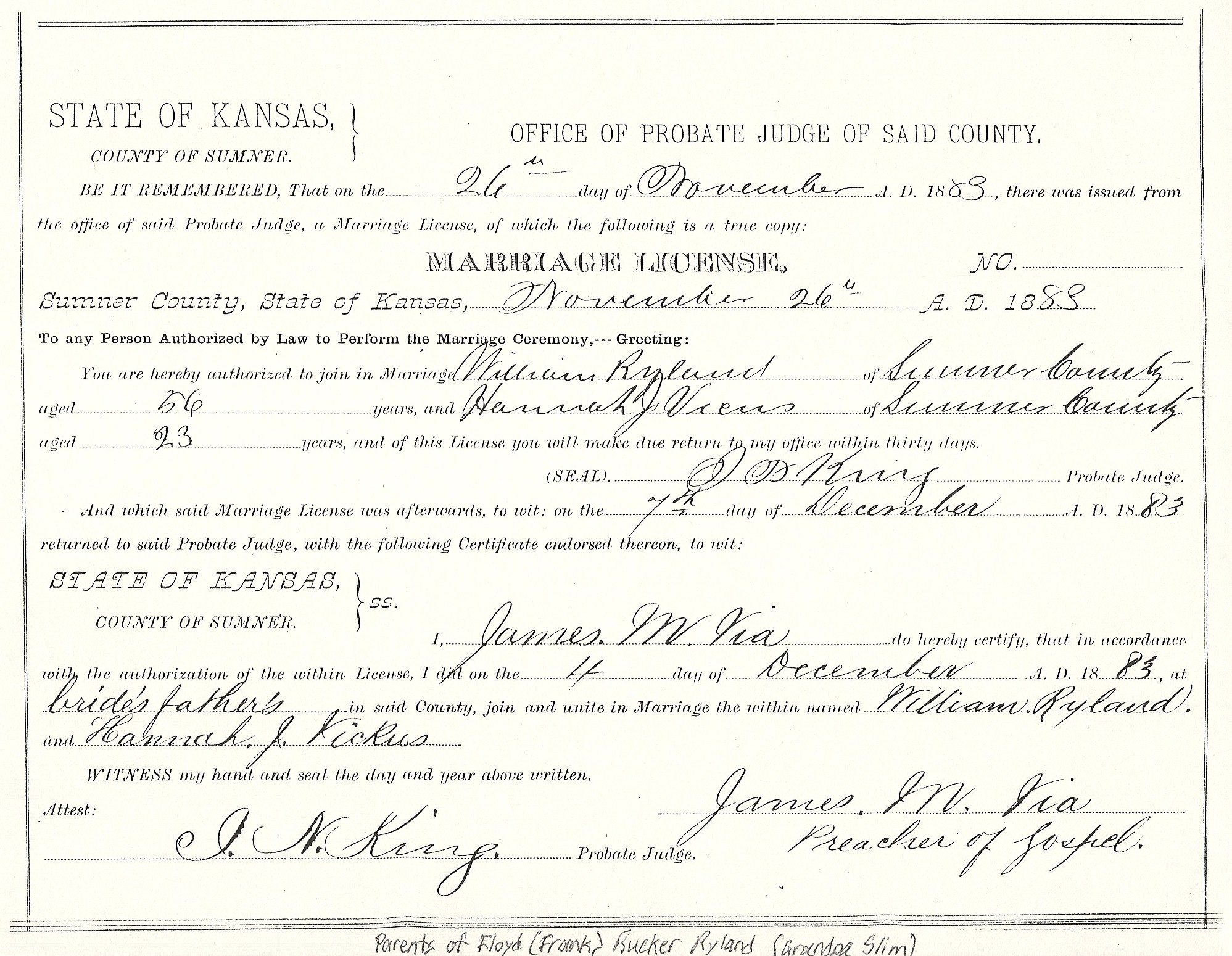Go here to this marriage index, where her marriage to William and then Carl Frederickson is recorded. Scroll down to Sumner County and click on “R” for Ryland: