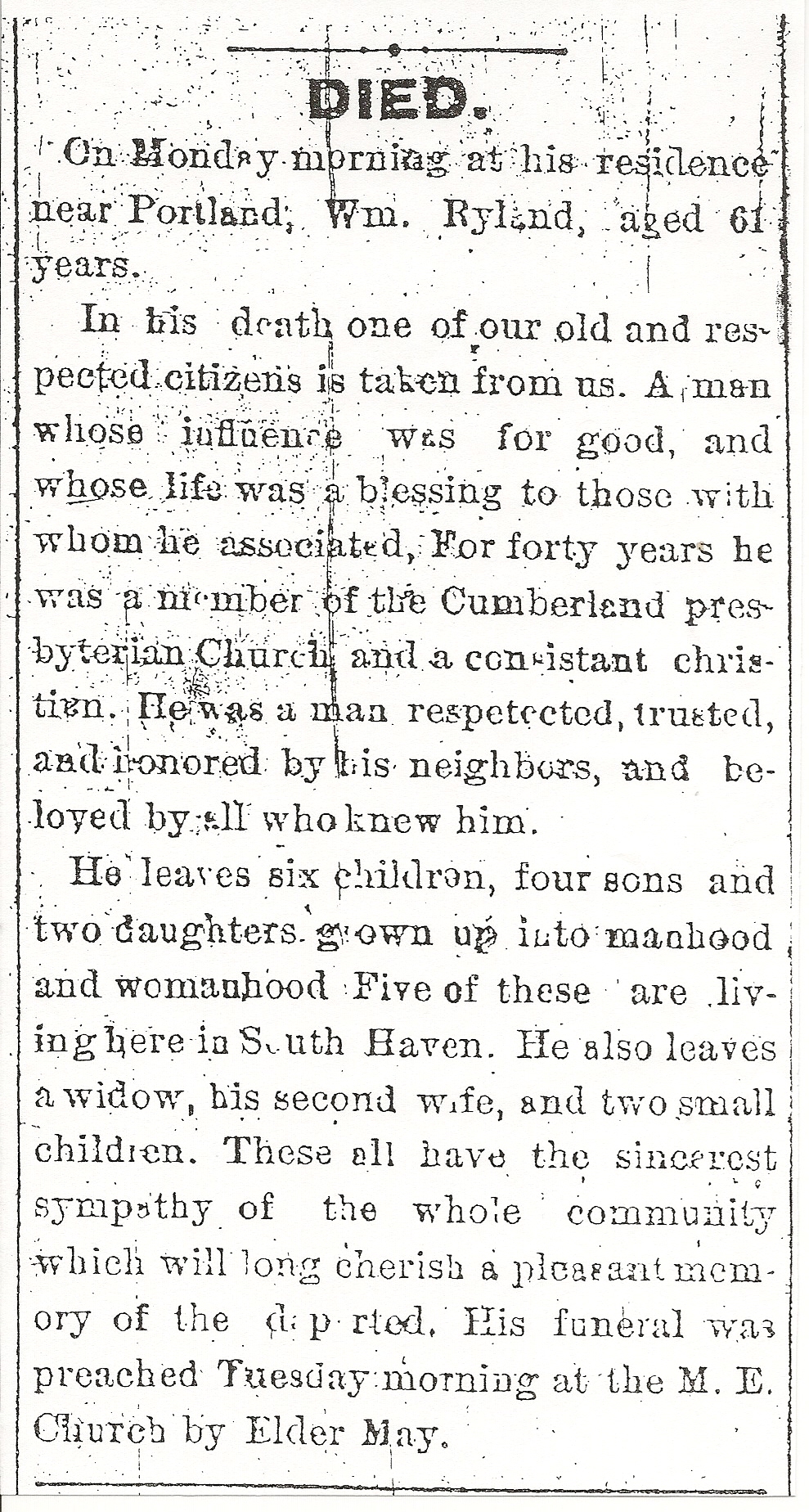 He was born November 13, 1827 in Ashland County, OH. He first married Sarah Baird / Beard on February 6, 1849 in Wayne County, OH. She died on May 17, 1882 in Randolph County, MO. (see the William Ryland and Sarah Baird post). Then William Ryland married Hannah Jane Vickers on December 4, 1883 in South Haven, Sumner Co., KS. He died May 21, 1888 in South Haven. He is buried in Rose Hill Cemetery, South Haven.