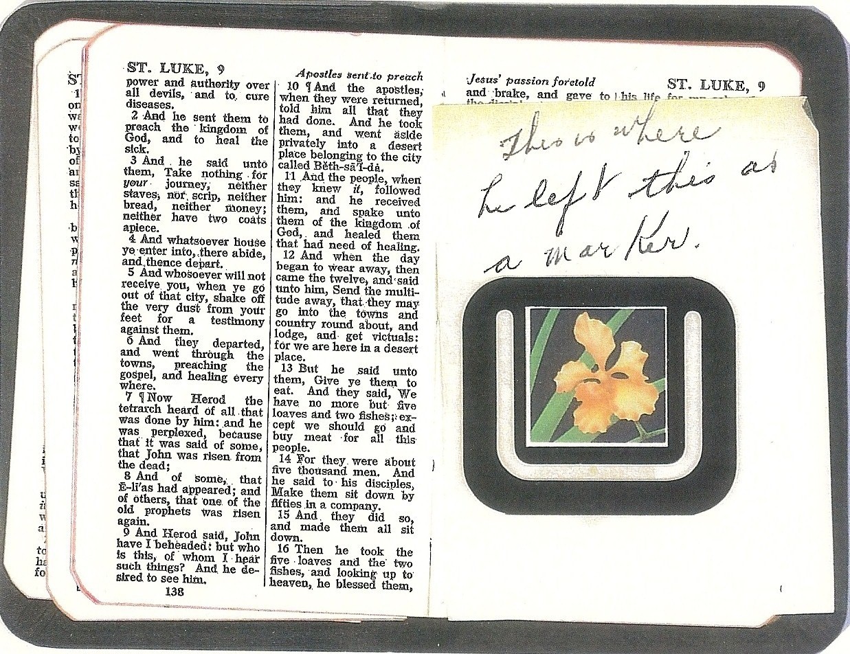 A few days before he died, he was reading the New Testament. In this photo his second wife Desi wrote on the bookmark on the passage where he had left off in the Gospel of Luke. He was getting his life right with God.