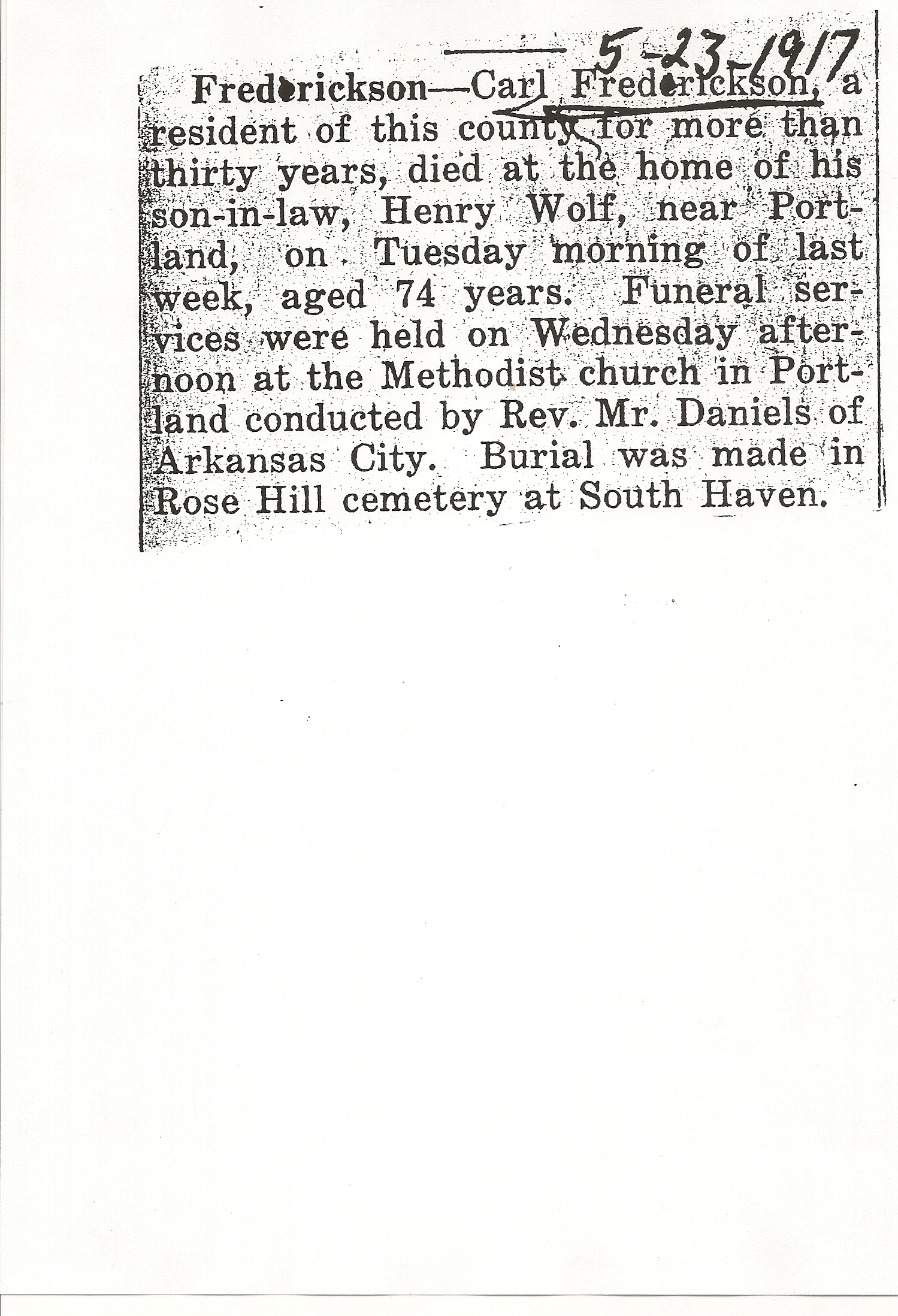 Mrs. Carl Frederickson of Portland died Saturday at 11:00 a.m. at that place of a tumor and cancer of the stomach. Mrs. Frederickson had been a sufferer from these troubles for some time and on Christmas day an operation was performed by Dr. Teller of Arkansas City and Dr. Piles of Portland in the hope of obtaining relief. The funeral services were held in Portland at 1 p.m. Sunday, and the remains were brought to South Haven for interment in Rose Hill cemetery. The deceased leaves a husband and five children – three daughters and two sons—mother sister and two brothers, immediately relatives, and a host of friends to mourn her loss. She was well known in South Haven, many of her friends being in attendance at the funeral.
