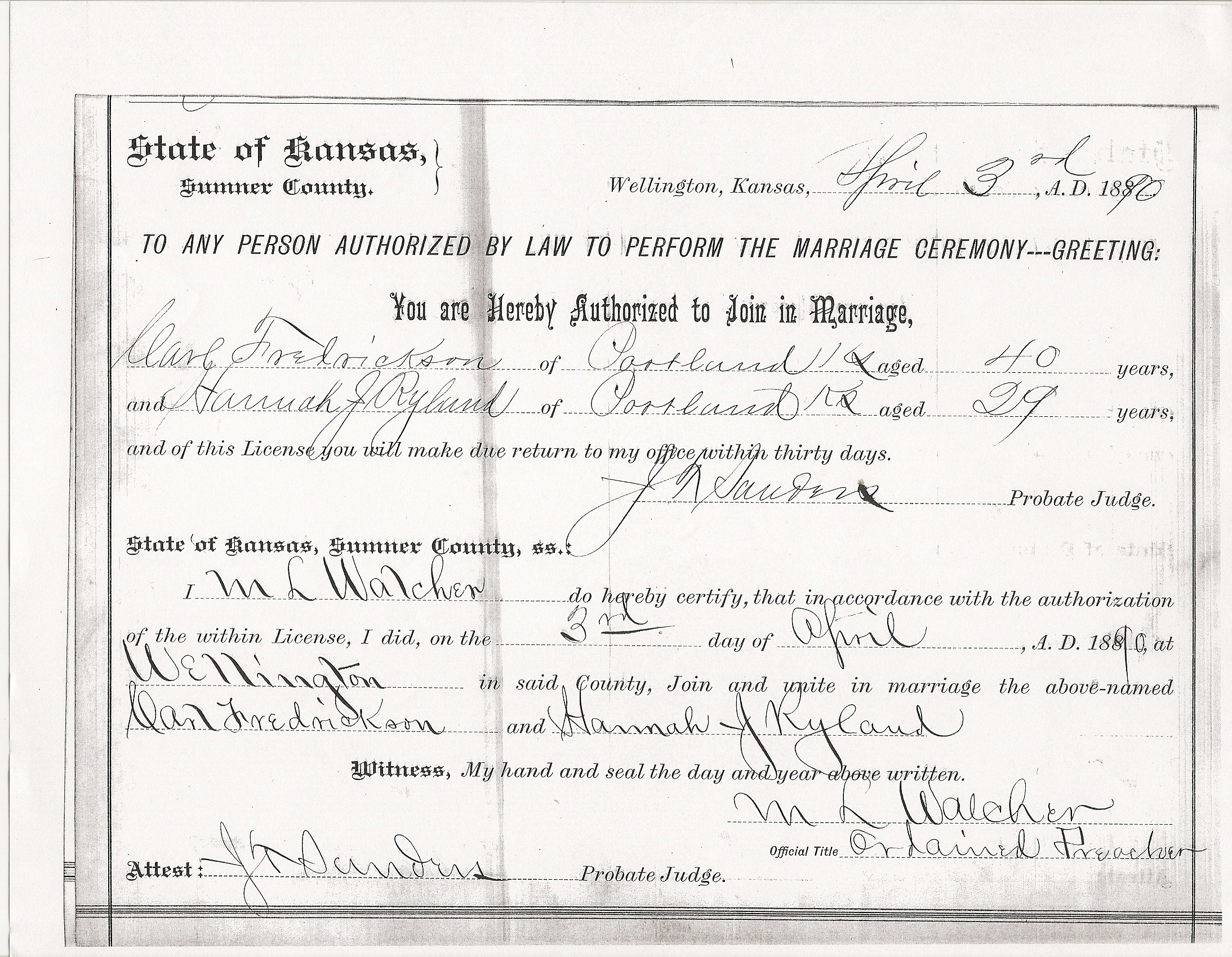 Marriage Certificate State of Kansas Sumner County Wellington, Kansas, April 3rd AD 1890. To any person authorized by law to perform the marriage ceremony — Greetings: You Are Hereby Authorized to Join in Marriage, Carl Frederickson of Portland, KS, aged 40 years, and Hannah J. Ryland of Portland, KS, aged 29 years, and of this License you will make due return to my office within thirty days. J. T. Sanders, Probate Judge State of Kansas, Sumner County, ss.: M. L. Walcher, do hereby certify, that in accordance with the authorization of the within License, I did on the 3rd day of April AD 1889 at Wellington in said County, Join and unite in marriage the above named Carl Frederickson and Hannah J. Ryland Witness, My hand and seal the day and year above written. M. L. Walcher Official title: Ordained preacher Attest: J. T. Sanders, Probate Judge. |